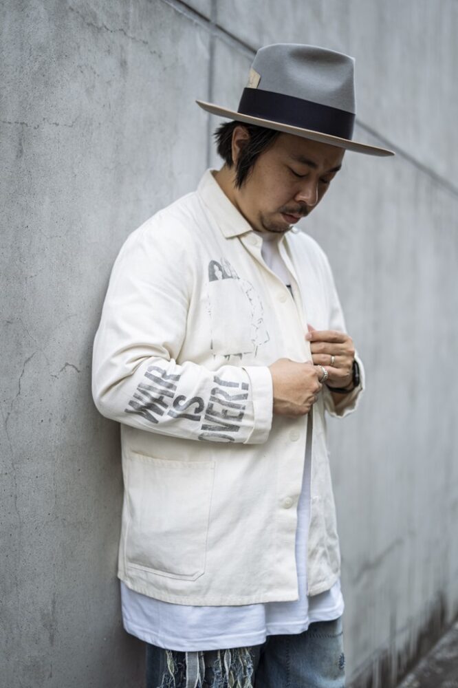 1940年代のユーロヴィンテージのワークジャケットに大阪のペイントアーティスト、Kurry氏にステンシルアートを描いてもらったもの。「10年以上前に描いてもらったアイテムです。Kurry氏とは、仕事でもコラボレーションなどもさせていただきました」