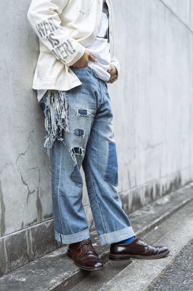 LEVI’S VINTAGE CLOTHINGならではの忠実なリプロダクツモデルに感銘を受け購入。「本家が作るリプロダクツに惹かれました。ベルトループのないモデルなので、ベルト代わりにデニム生地を三つ編みにして縛っています」
