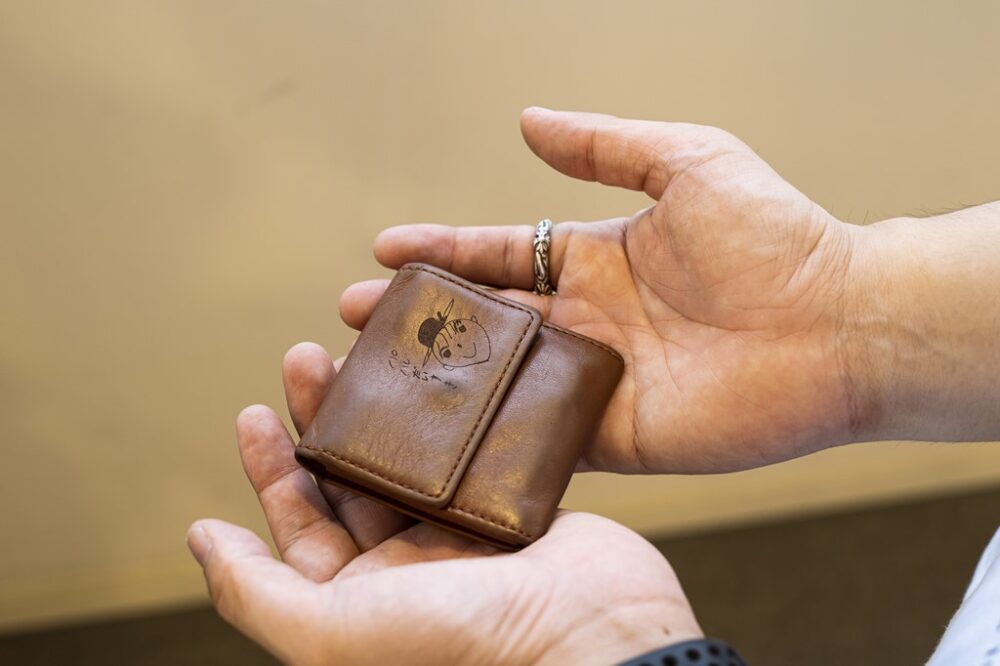 娘から父の日にプレゼントされたレザーコインケース。「5歳の時に描いた父の似顔絵がレーザープリント。ものづくりをしているボクにモノの贈り物が嬉しいですね。しっかりハットを描写しているんです」