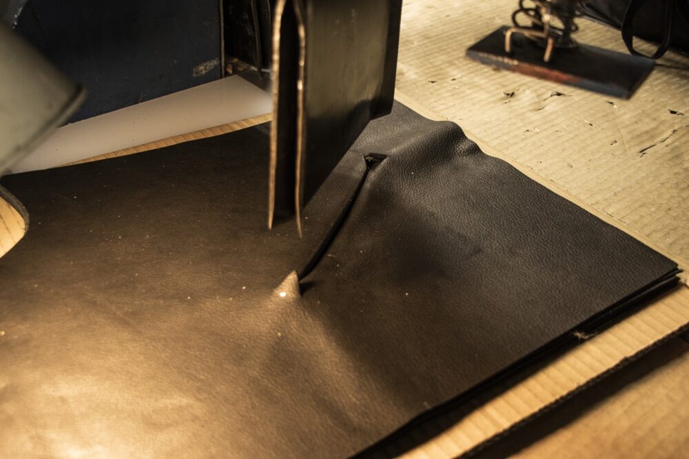身頃のパーツに、スラッシュポケット用の切れ込みを入れていく。この際、革を重ね合わせ、6枚同時に切っていくことができる。