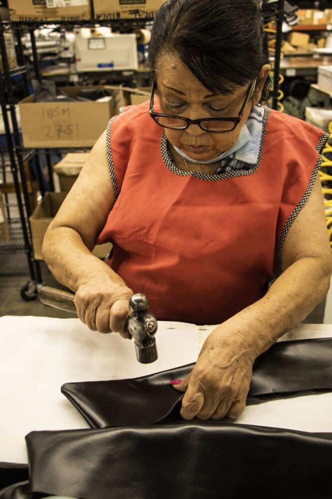襟の縫い合わせ部分を叩いて馴染ませていく。この作業を行うカーメンさんはSchottのファクトリーに34年勤める大ベテランだ。