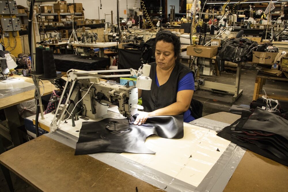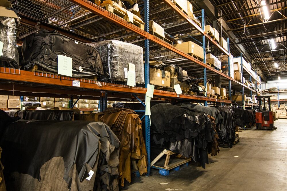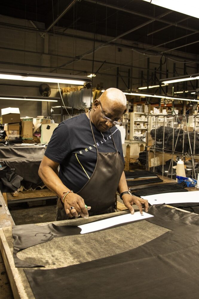レザージャケットにとって非常に重要な工程が「裁断」。傷を避け、革の繊維の方向を読みながらパーツを切り出していく。この繊維の向きを読み誤ると、型崩れの原因にもなってしまう。