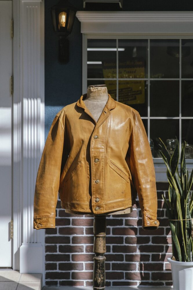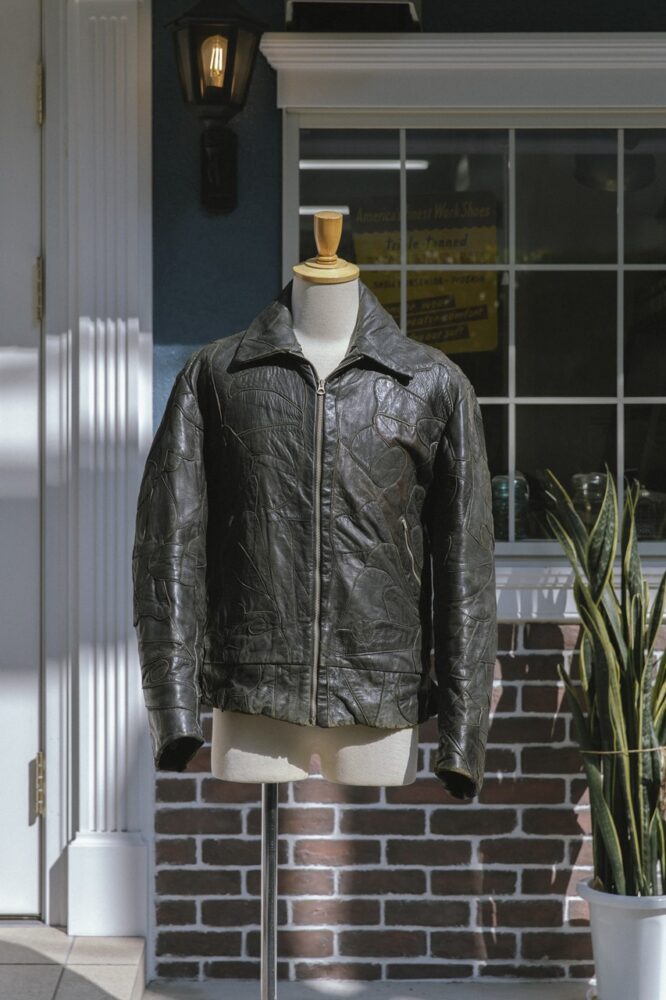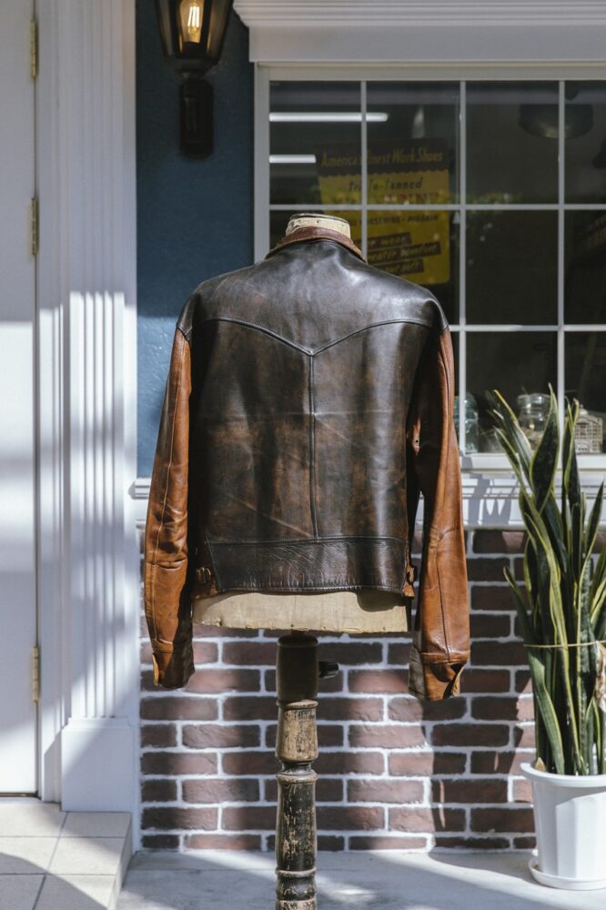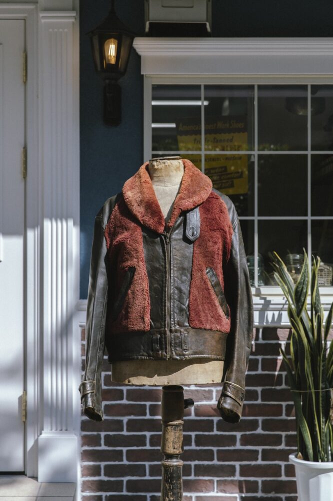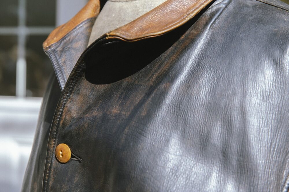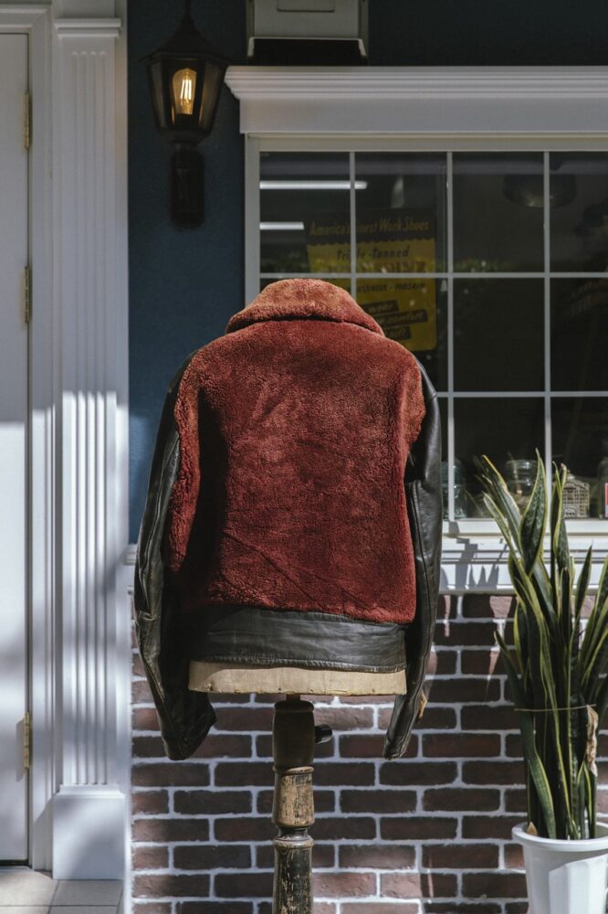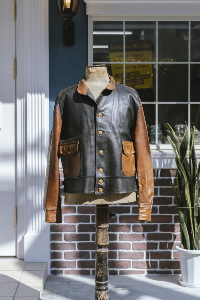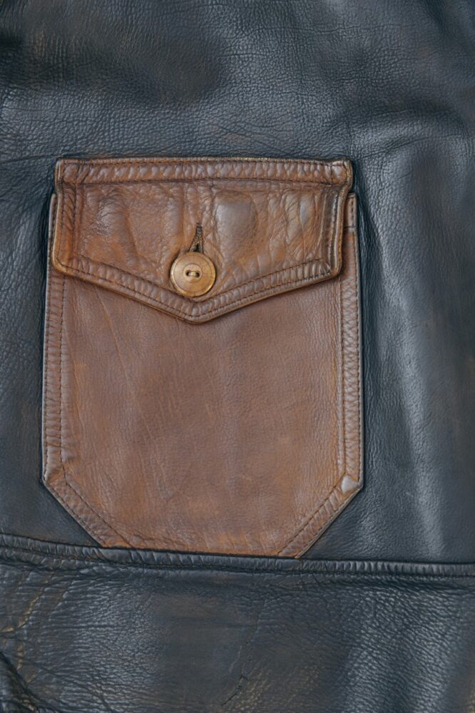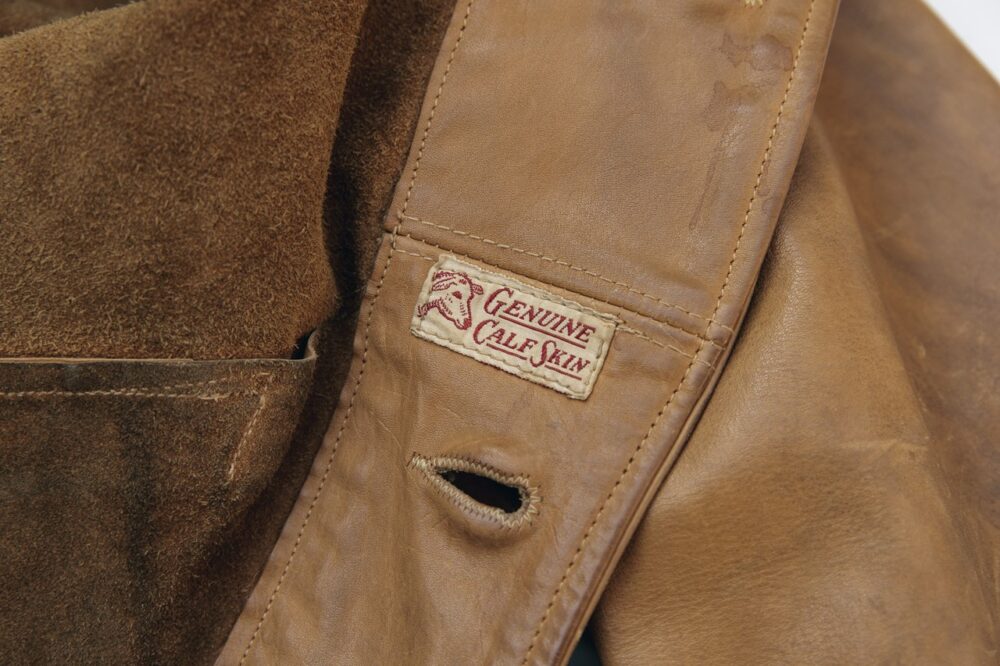 上品なカーフスキンを使ったスポーツジャケットは、なんとも珍しいツートン仕様が際立っている。20年代にメジャーであったA-1タイプのデザインで、襟はショールカラーを採用。まるでハンドメイドで塗ったようなムラ感のある風合いがたまらない1着である。