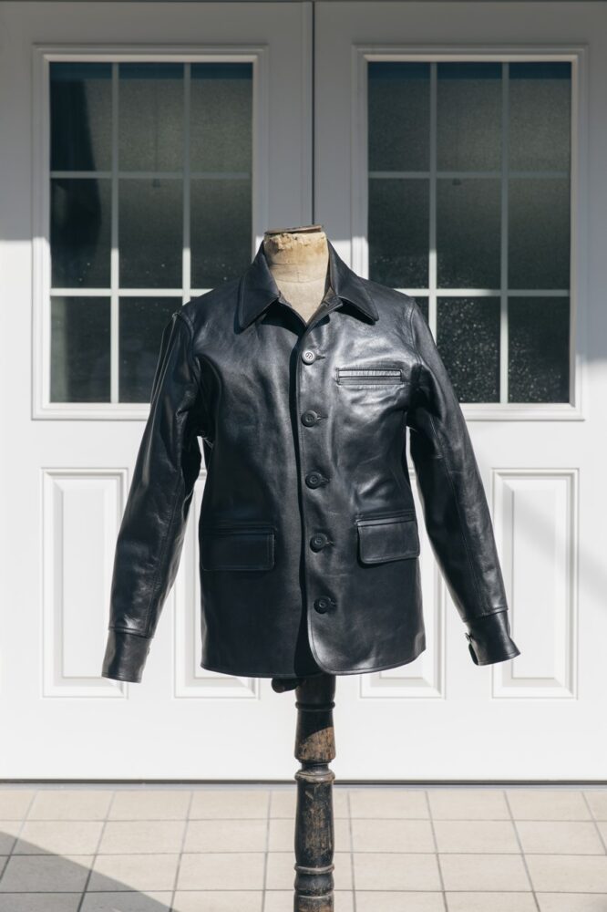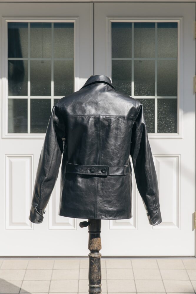’20~’30年代のシングルタイプのカーコートを再現。ボディには茶芯のホースハイドを使用。前身頃の切り替えがない1枚仕立てやボタン式の背帯などをうまく落とし込んだ。¥176,000_