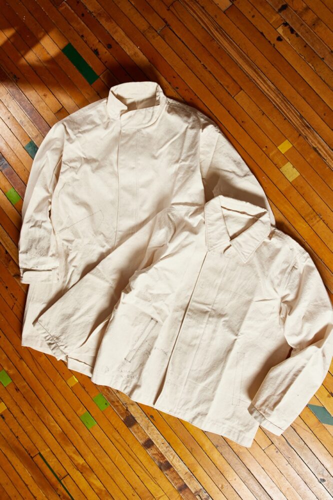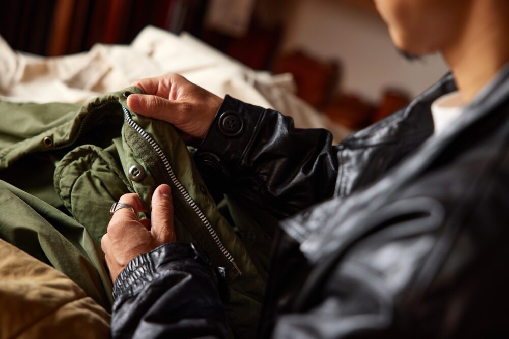 そんな天神ワークスが今回新たに取り組むジャンルが「ミリタリー」だという。「え? 天神ワークスがA-2を作るの?」と思った方も多いかもしれない。それはそれで興味深いが、そうではない。天神ワークスが挑戦するミリタリー、それは昨今ストリートで人気のM-65パーカ、そして防寒性の高いA-2デッキ。このコットン製の2種の名モデルを、今回天神ワークスはレザーで再現したのだ。