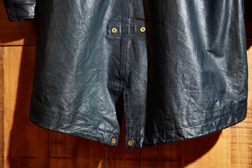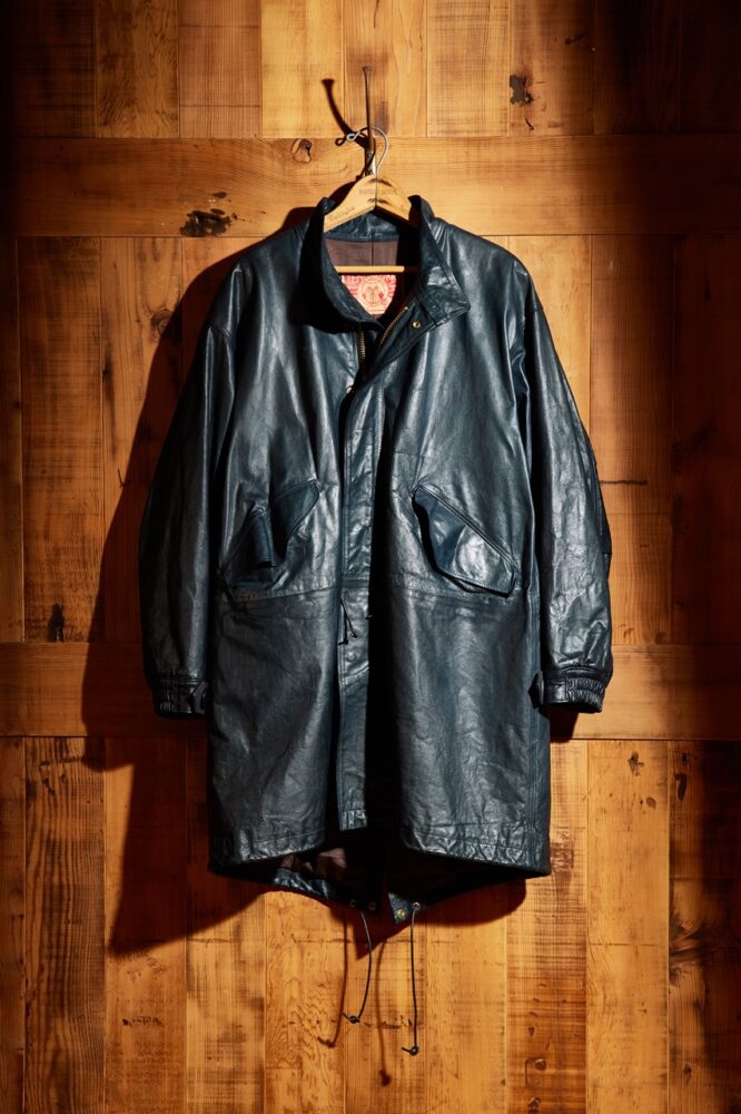 デザインソースとなったのは、ミリタリーコートの定番として愛されているU.S.ARMYのフィッシュテールコート。1970年代前後の個体をベースにしており、シェルはオイルドキップレザー。防寒性に優れた独自のドレープ感を楽しめる1着に仕上がっている。