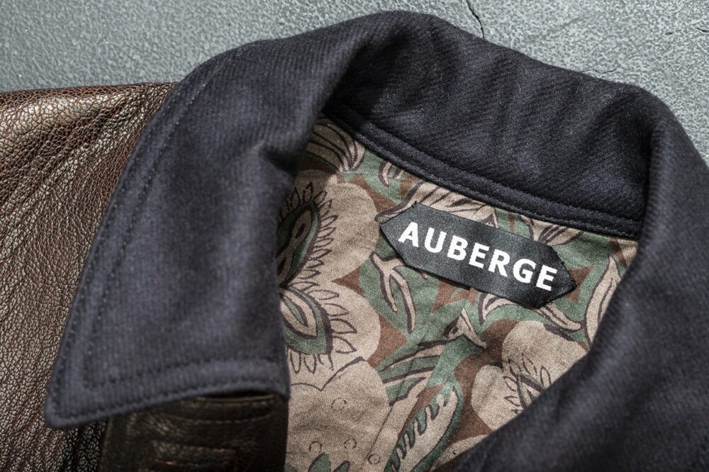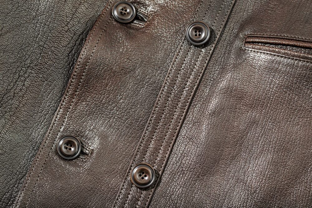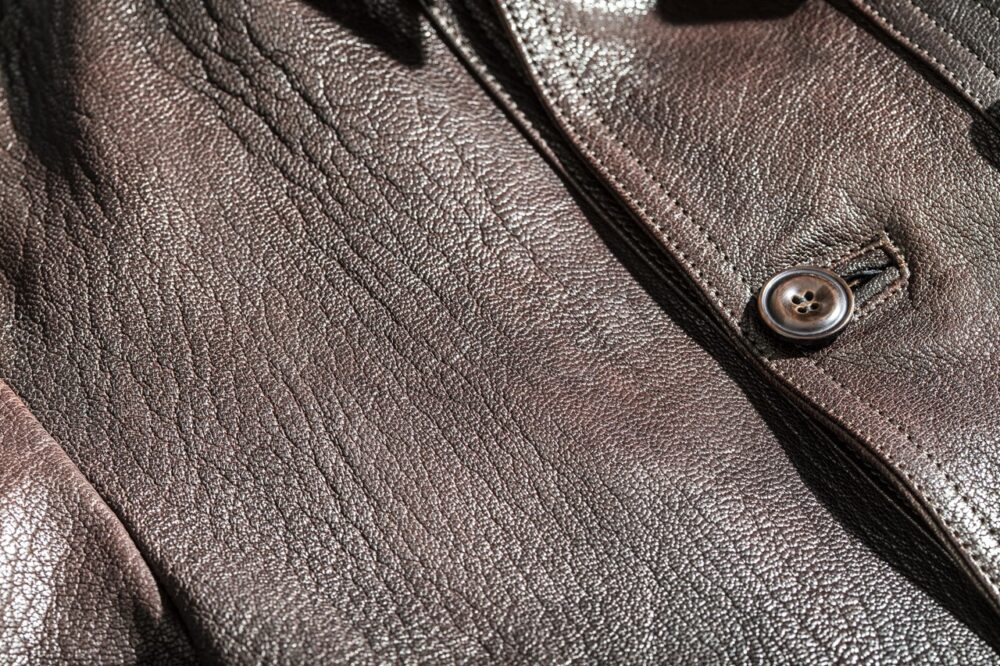 当時の剥がれやすいラッカー塗装や大きな成牛ならではのシボなどの荒々しい雰囲気を再現するために、ベジタブルタンニンのマウンテンゴートを使用。特徴的なウールを使った上襟などもしっかりと再現している。’18年のファーストコレクションでリリースし、定番の型として、様々なファブリックで展開している。なんともいい風合いだ。参考商品