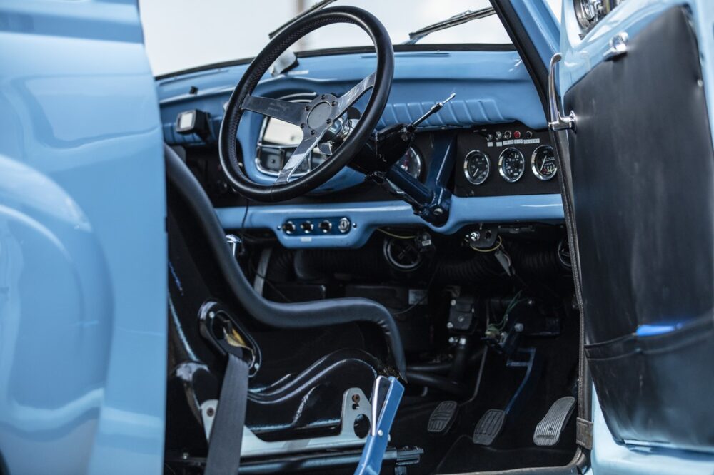 スポーツハンドルにバケットシートが積まれたレース仕様車。淡いブルーのボディカラーが、そのまま内装にも剥き出しで使われているのが実にクラシック。