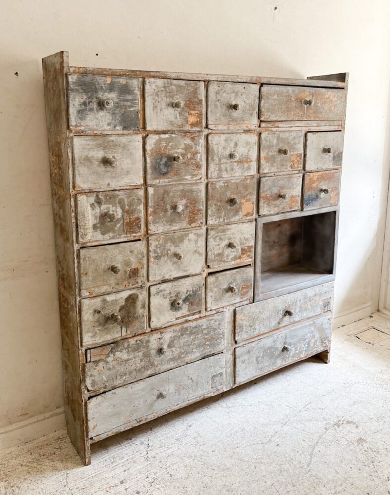 経年によって剥げた塗装や、リペアによって引き出しの取っ手が不揃いだったり、引き出し部分が壊れたのか、棚に作り替えられているなど、修理もオリジナルに忠実ではなく、アーティスト感覚溢れる自由度の高い補修となっている部分が見逃せない。