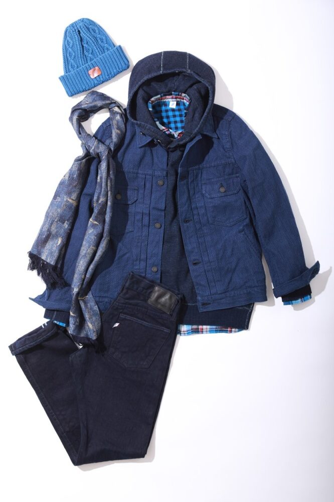 インディゴで統一し、濃淡によりグラデーションを表現したpure blue japanらしいコーディネイト。インナーに着用したチェックのシャツやボロ(古布)をイメージしたジャカードストールなどが、インディゴ単色の中で大きな存在感を発揮している。すっきりとしたシルエットの刺し子ジャケットにスリムジーンズを合わせスマートな印象だ。