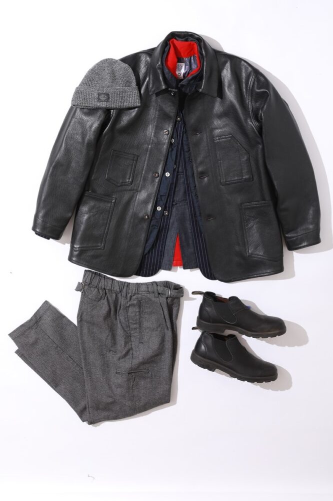 ’90年代に数シーズンのみ展開され、カルト的な人気を誇っていたDe Luxe Railroaderをプレミアムゴートスキンで再構築したアウターがメインのコーデ。シャツ、エンジニアジャケット、チャイナジャケット、ベストをレイヤードしており、なんとも洒落た印象に。足元はあえてサイドゴアブーツにすることで、うまくバランスを取っている。