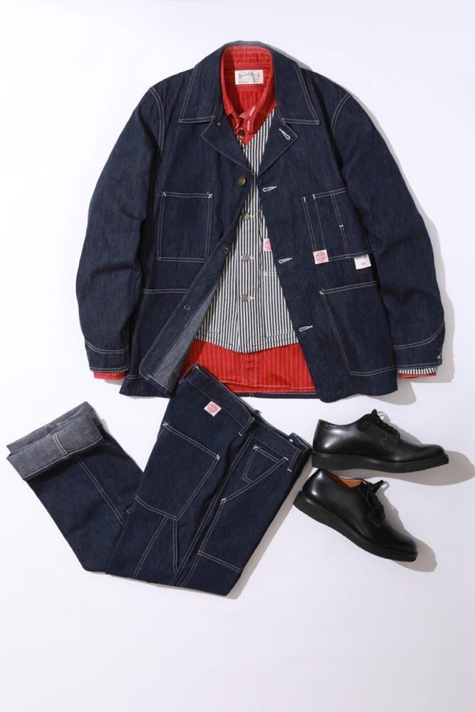 デニムワークコートとダブルニーパンツのセットアップ。インナーの赤のストライプシャツがアクセントとなり濃紺デニムに映える。またシャツの上からレイヤードしたヒッコリーストライプのエンジニアジャケットとのストライプのリンク、さらにはショート丈であるため、裾から覗く赤もポイントだ。すべてワークアイテムだが、カラーの変化やド直球のワークブーツではなくポストマンを合わせ、ワークを上品なスタイルへと仕上げた。