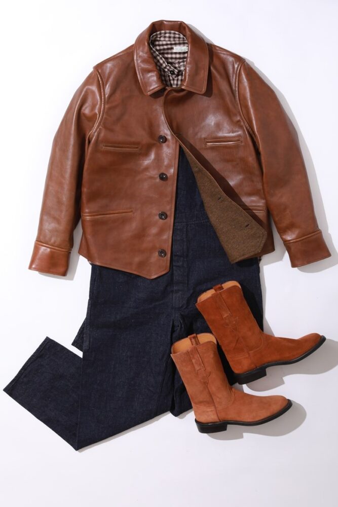 防寒性や、全身を土埃から守ることを目的としたカーコートはロング丈がメインだが、これは珍しいショート丈。当時はカバーオールの代わりに着られていた実績があり、そんな背景を感じさせるオーバーオールを合わせたコーディネート。同系色のチェック柄シャツがいいアクセントになっており、足元はローパーブーツで男らしく仕上げた。