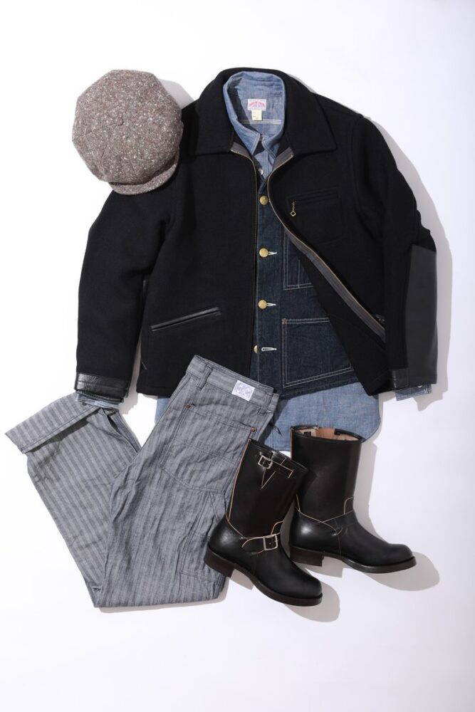 JOE McCOYが、ワークジャケットとして提案する1940年代のヴィンテージをベースに製作したウールのフィールドジャケットは馬革とのコンビデザインが印象的で、同じ馬革のエンジニアブーツと素材を合わせるさりげなさに大人の余裕を感じさせる。インナーにはノーカラーのエンジニアジャケットをベストのように見立て、寂しくなりがちなフロントに金ボタンがチラリと見え隠れするのも洒落者のテクニックが効いている。