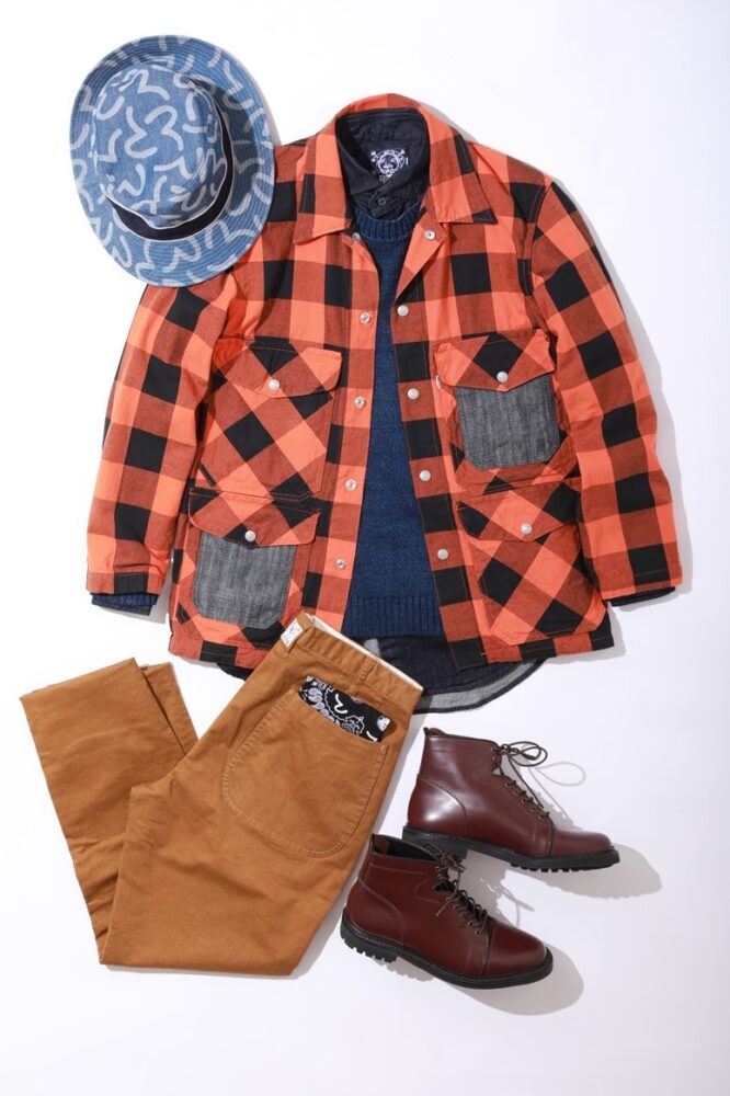 森のワーカーであるハンターのためのジャケットをEVISU流にアレンジしたバッファローチェックのジャケットを主役にB.D.シャツとコットンニットのレイヤードでEVISUらしいワークアイビースタイルを表現。テーパードの効いたトラウザーズがブーツとトップスのボリュームを中和させ、上品なワークスタイルに仕上がった。