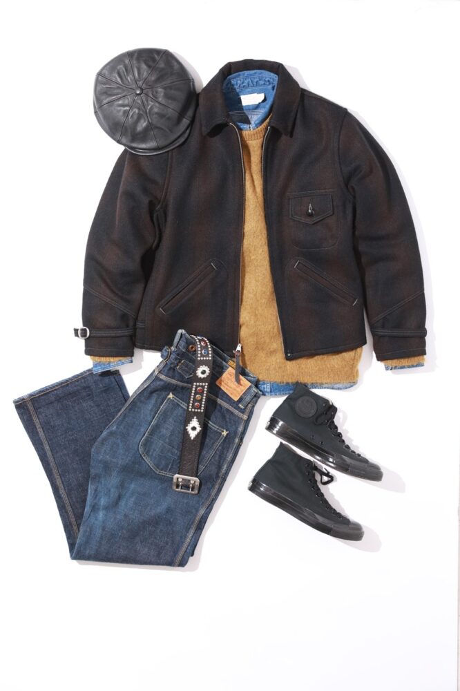 アルパカをブレンドしたウールメルトンのジャケットに、定番のデニムパンツとウォッシュ加工のシャンブレーシャツなどでコーディネート。ニットやレザーキャスケット、ベルトなどを効果的に使うことで、上品かつクラシックなスタイルにまとめているのが好印象。また足元はあえてミリタリーのトレーニングシューズにした点も注目だ。
