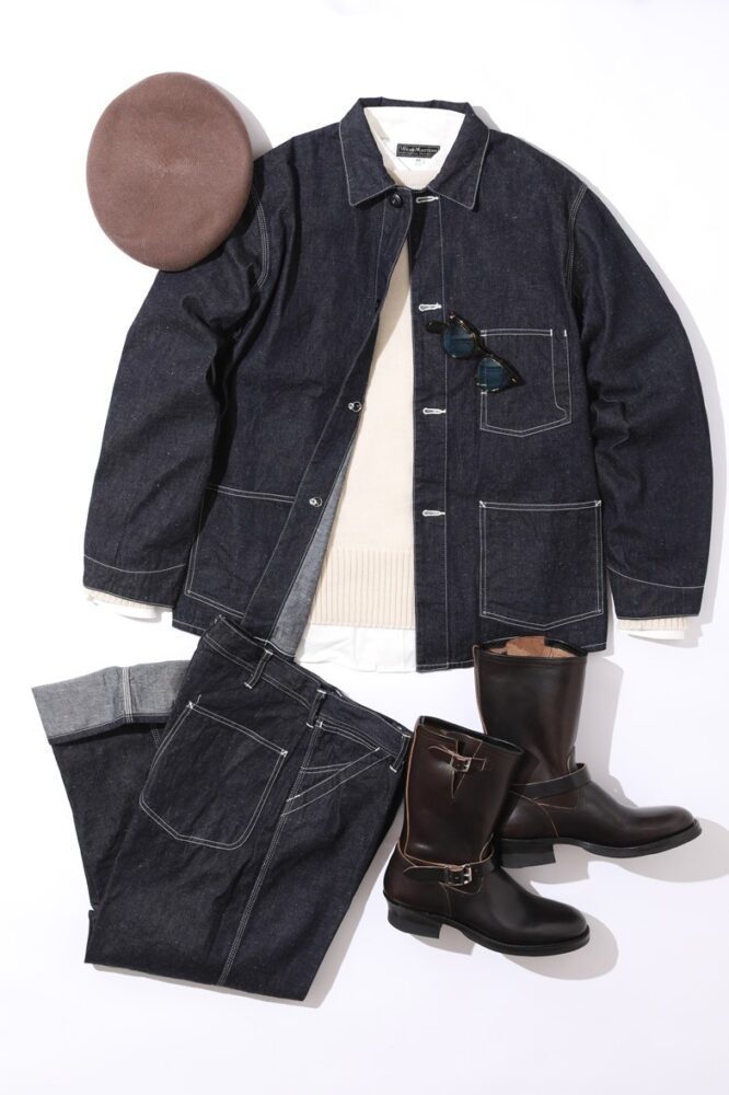 10.5ozのデニム生地を使用したカバーオールとペインターパンツのセットアップ。どちらもゆったりしたシルエットであるため、だらしなく見えないようインナーのシャツやシューズ選びには気をつけたい。アイウエアやベレー帽など、シンプルな小物を追加するのも効果的。またロールアップなどでスタイリングに動きを付けるのも良いだろう。
