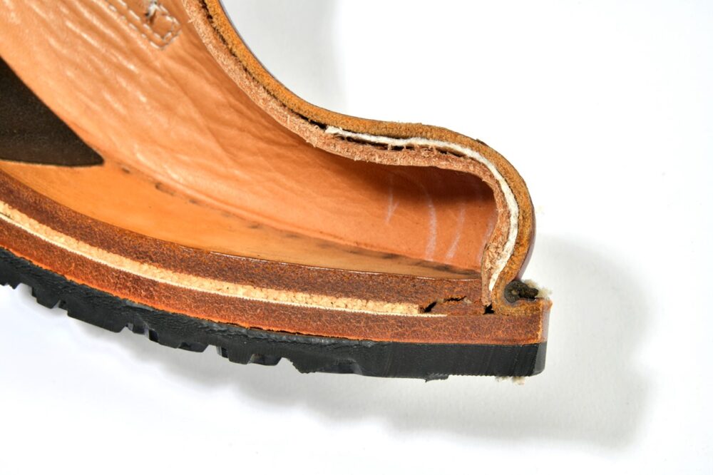 トゥの内側、つまりアッパーとライニングの間に芯材を入れることで、型崩れ防止にもなり、つま先を守ることができる。ミッドソールにはコルクシートが挟み込まれている。