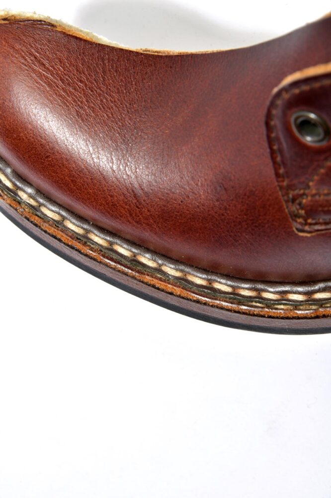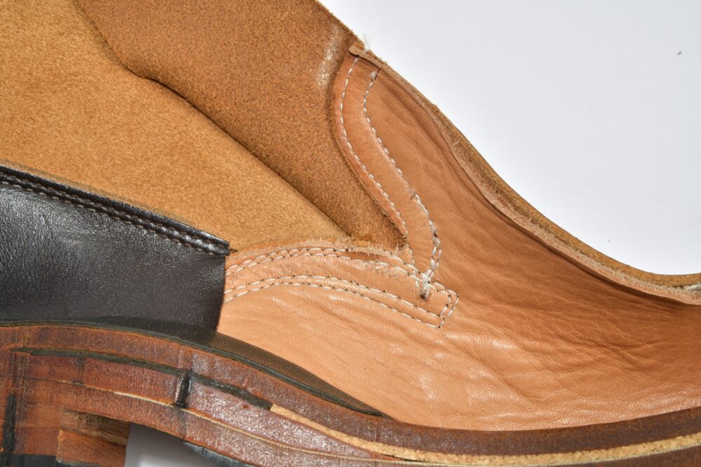 トゥから甲にかけて表革のライニングを貼り合わせることで、足入れしやすく、かつアッパーから甲にかけての強度が増されている。型崩れ防止としても有効なディテールだ。