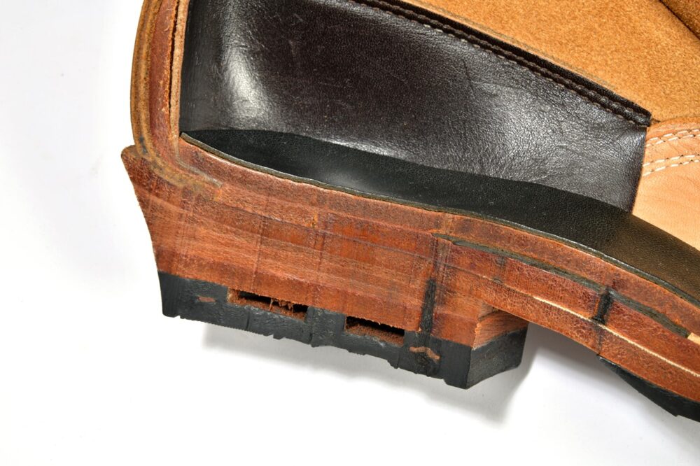 ヒールカップも脱ぎ履きなどによって、大きな負荷がかかる重要な箇所。ソールはセミドレスらしいロガーソールで、熟練した職人がハンドメイドで美しい曲線を形成する。