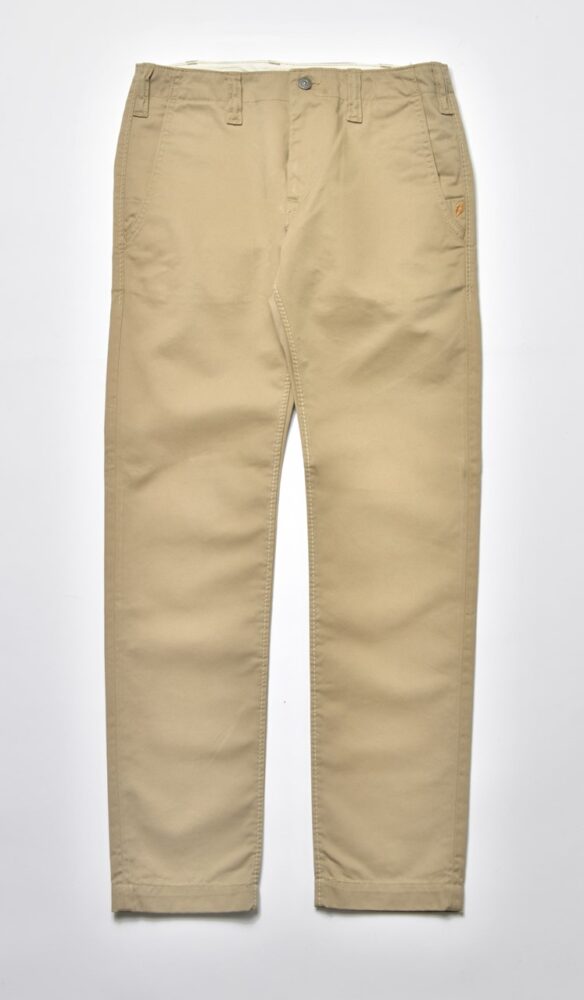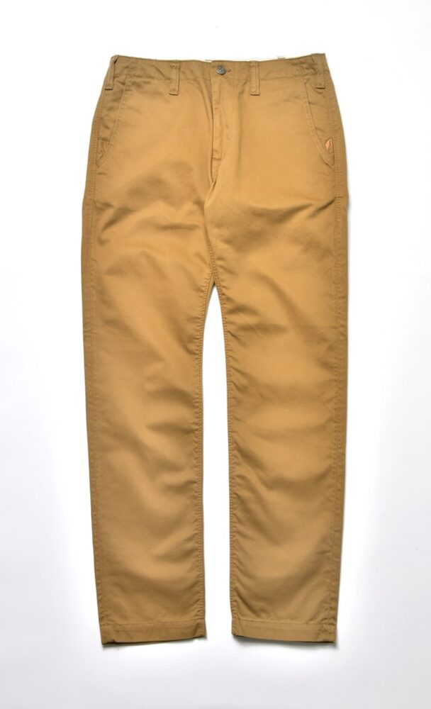 滑らかでしっとりとした手触りがありながら、高密で織り上げたことによるハリやコシを感じる生地はオリジナル。生地の段階で表面を微起毛し、特殊な洗いによって起毛を毛羽立たせたのちに硬く仕上げるという加工技術によって実現した。同ブランドとしては珍しいゆったりとしながらも、穿くとすっきりと見える新たなシルエットはワークトラウザーズの新解釈といえる。3色展開。¥22,000_