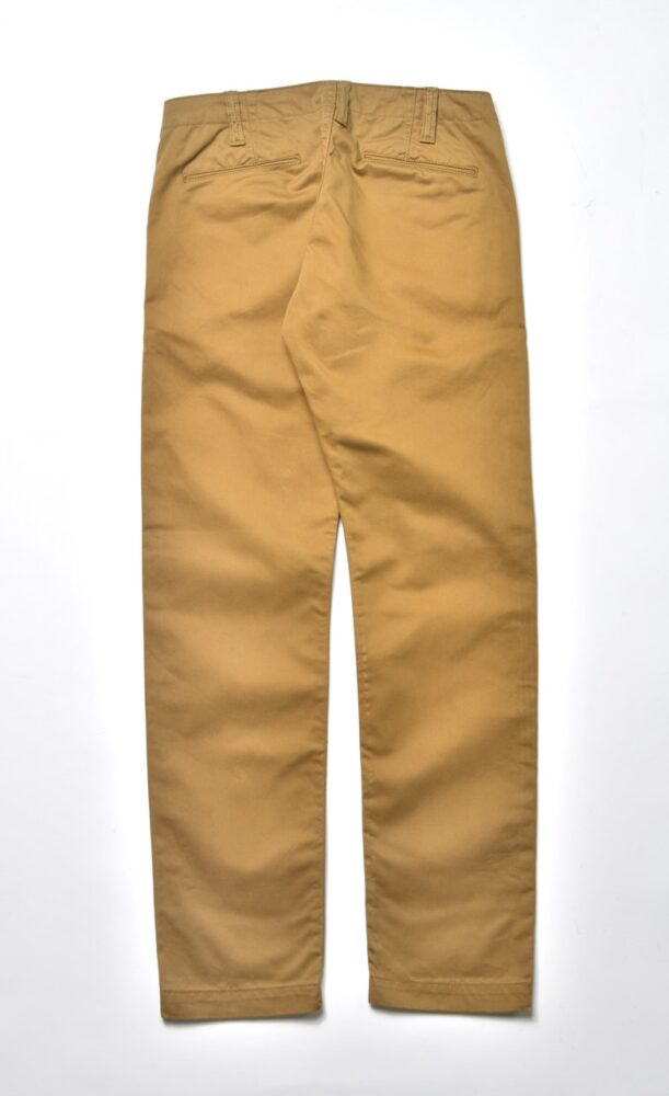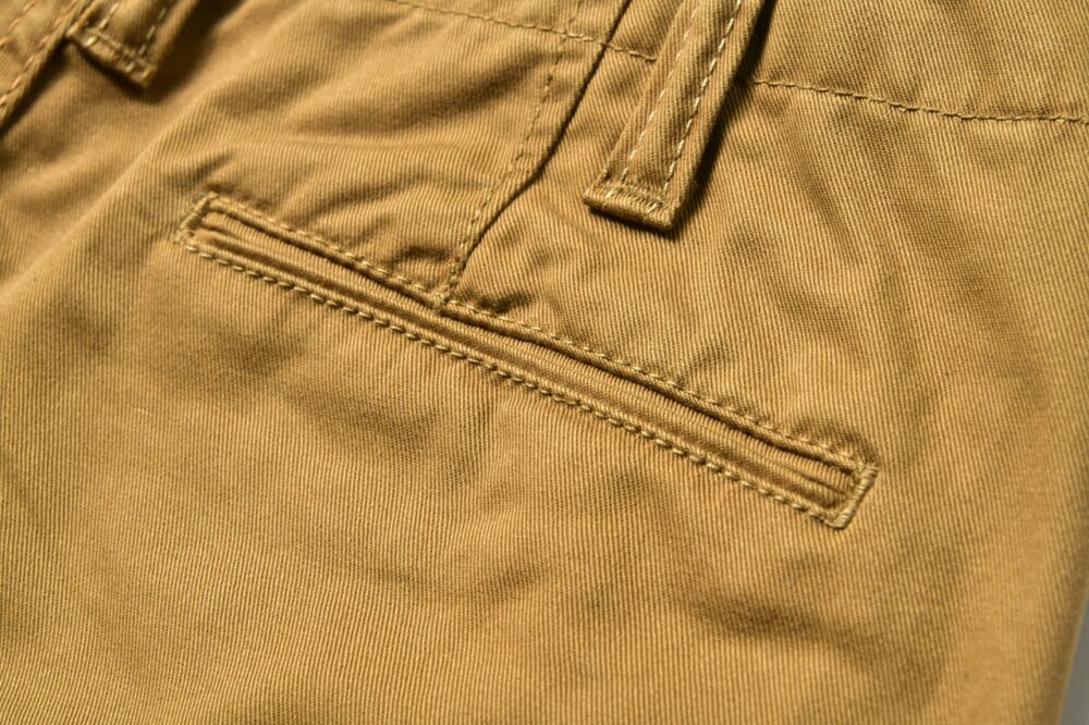 バックポケットは両玉縁仕様。中央が盛り上がったベルトループや各所に太い綿糸で縫製するなど、シンプルなデザインのなかにも、さり気なく個性が見える縫製仕様だ。