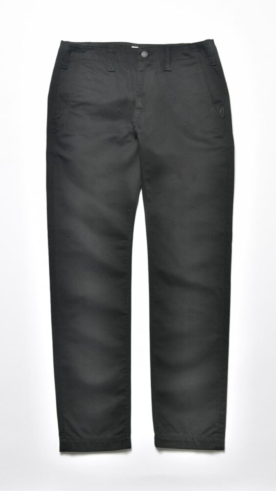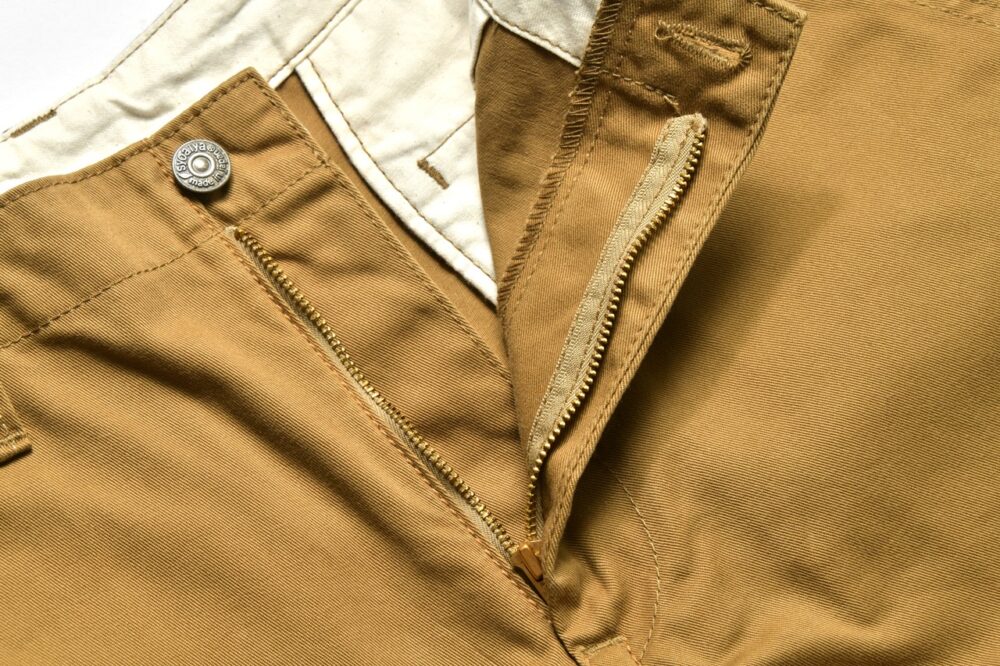 シルエットはゆったりとしているが股上は浅めの設定。フロントはジッパーフライだが、トップボタンはジーンズと同様になるオリジナルのタックボタンになっている。