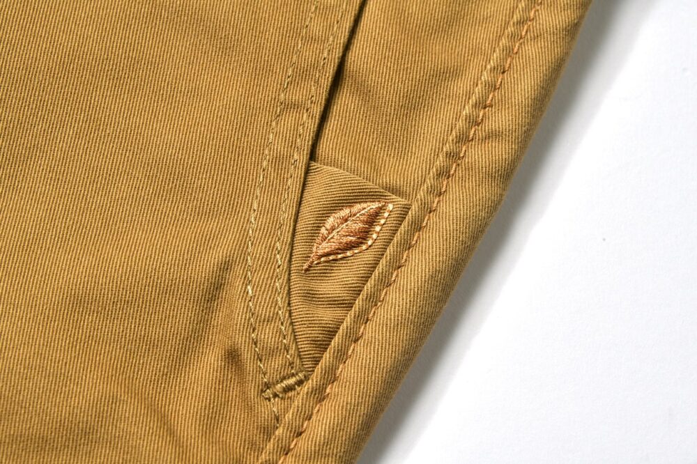 サイドポケットは下部にガゼットを設け、そこにブランドロゴの刺しゅうが入るデザイン。一般的なワークトラウザーズのデザインをひと捻りしたデザインでオリジナリティを出す。