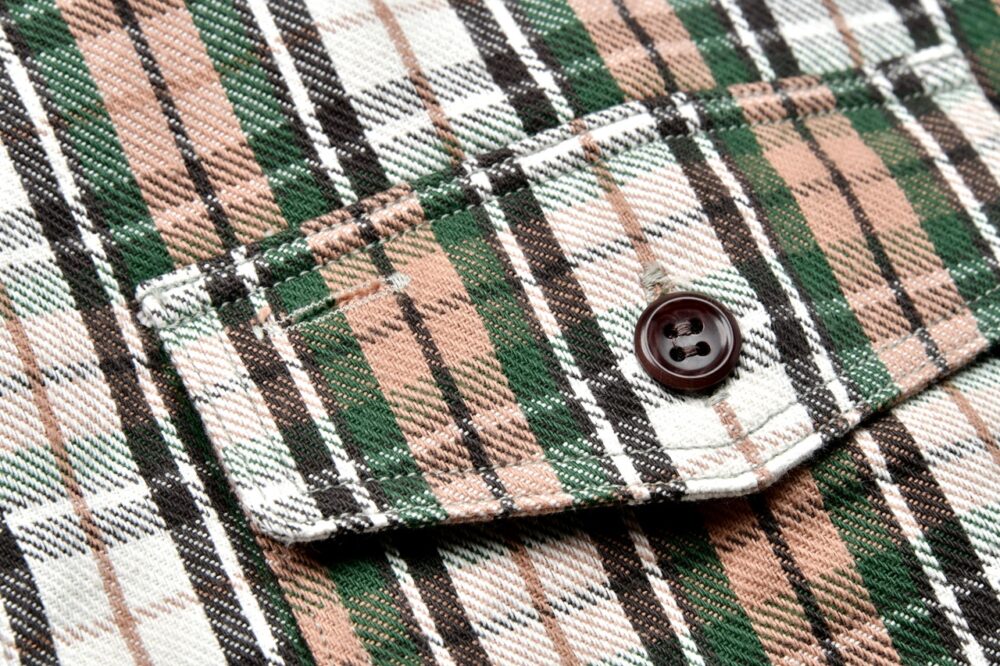 WAREHOUSEでは、そんなネルシャツを時代性で分けて展開している。20年以上生産し続ける定番モデルだけでなく、旧い時代のものには『DUCK DIGGER』のラベルを付けて別にラインナップしている。今回紹介するものは、チンストラップを装備する後者のモデル。ウールに似た発色も魅力だ。