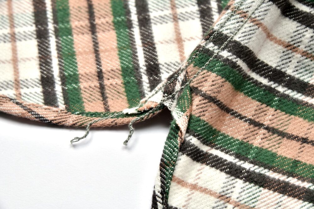 フランネルシャツのチンストラップは、カバーオールと異なり、どんなメーカーでもこのような長さのものが多い。