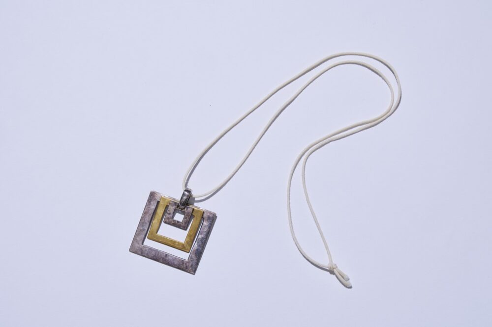 ミッドセンチュリーを感じる幾何学的なデザインのネックレス。大小のスクエアのなかにひとつ真鍮製のパーツを組み合わせているところが優秀。ここ最近は大活躍していて、何気ない気の抜けたコーディネイトでも、これを身につけると全体のトーンが引き締まるような気がする。