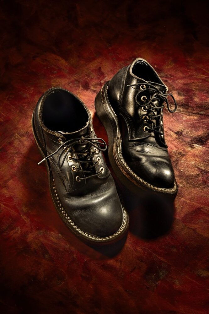 7、8年ほど前に『Lightning』別注アイテムとして作ったセミドレスのオックスフォードシューズ。確かフレンチカーフとクロムエクセルの2種類で作った限定モデルで、断然フレンチカーフでしょ!って迷うことなく手に入れた1足。だってWHITE’S BOOTSにフレンチカーフですよ? しかも穴飾り付きのキャップトゥがクラシカルで良いじゃないですか。これね、お世辞抜きで、いま見てもカッコ良い。サイズを選ぶときにドレスシューズ同様、ジャストサイズ、素足に合わせて買ったのも大正解。いまもこれを履くときはだいたい素足で履いていますね。アーチイーズをダイレクトに感じることができますからね。5インチや6インチもあったら買っちゃうだろうな。