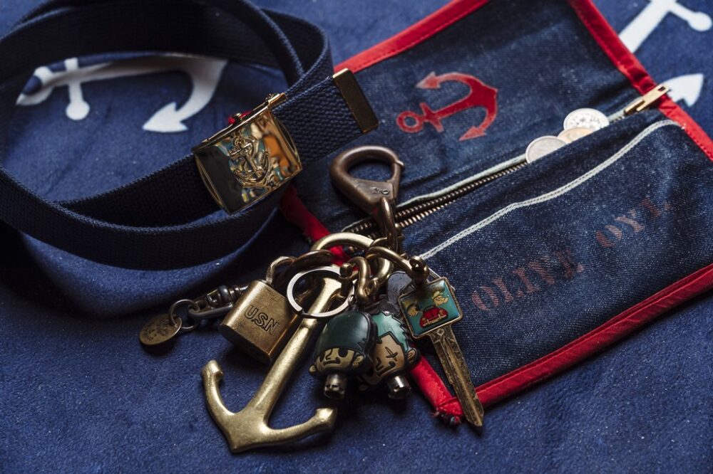 いつも身に着けているベルト、ウォレット、キーケース。ほとんどに錨モチーフが入っており、ウォレットはコーンミルズの生地で自作したもの。