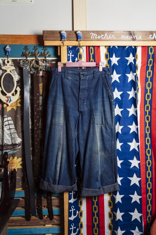 1940年代製U.S.NAVYのデニムトラウザーズはワイドシルエットで色落ちも上品。フロントはボタンフライ仕様となっている。