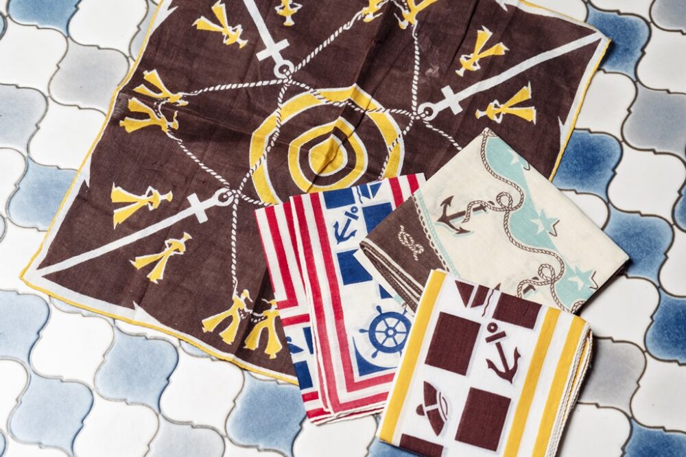海軍に関係するバンダナやスカーフも長年コレクションしているアイテムのカテゴリーのひとつ。錨マークや水兵がコミカルに描かれている。