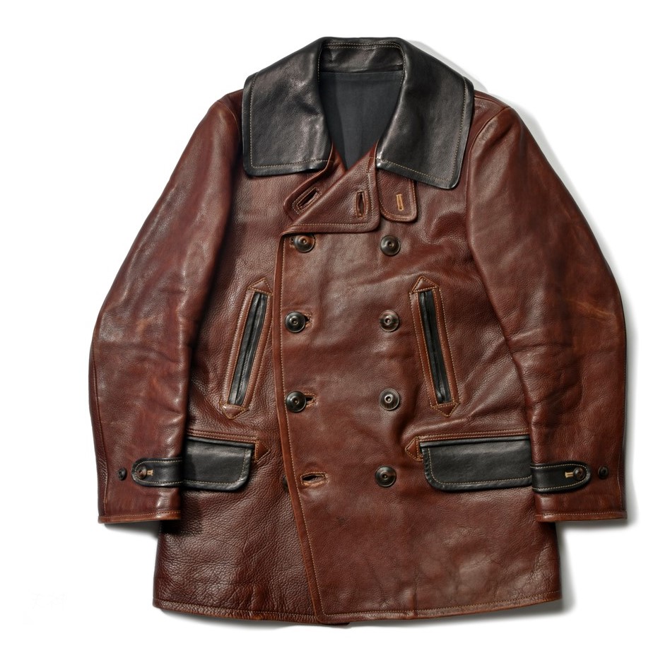 1920年代以前のピーコートをデザインベースに良質なレザーで仕立てた。ライニングはコットンサージを採用し、クラシカルに。¥214,500_(TENJINWORKS Tel.03-3870-8658)