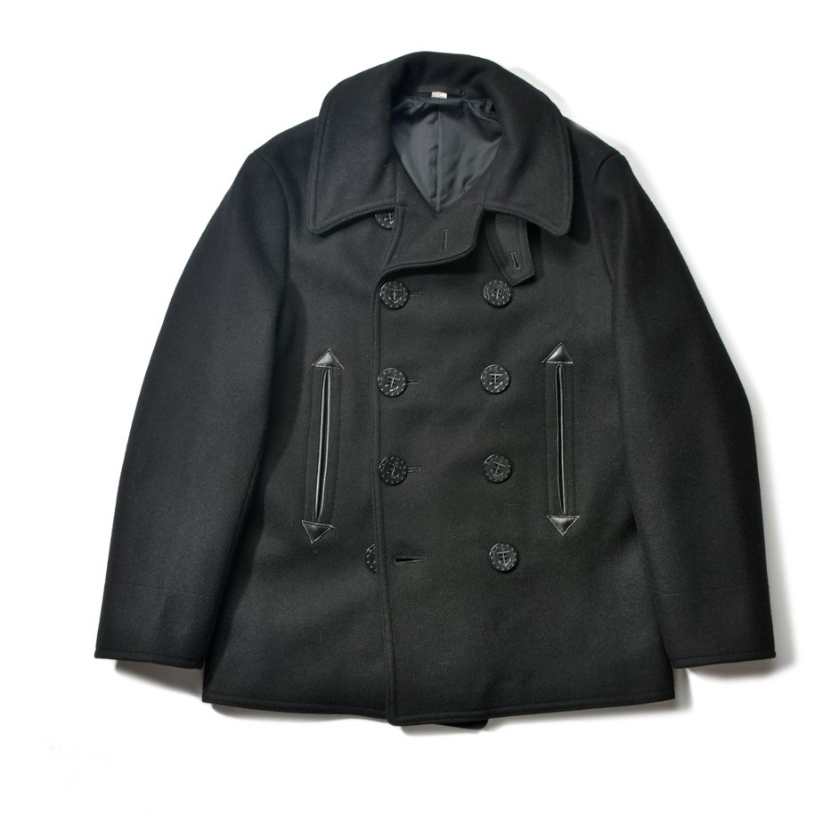 高密度な36オンスウールメルトンを採用したオールブラックのピーコート。ポケット口は補強も兼ねたレザーの玉縁仕様。¥70,400_(BUZZ RICKSON’S Tel.03-3632-2321)