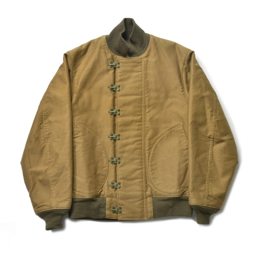 初期のデッキジャケットはフロントがファスナー開閉式だったが、海上で作業する兵士たちにとって塩害は避けられるものではない。ファスナーが錆び付いてしまっては防寒もできないことから、改良されたのがフックタイプの通称デッキフックと呼ばれるモデル。ウールライニングこそ装備されるものちに、より保温力の高いアルパカライニングへと変更される。