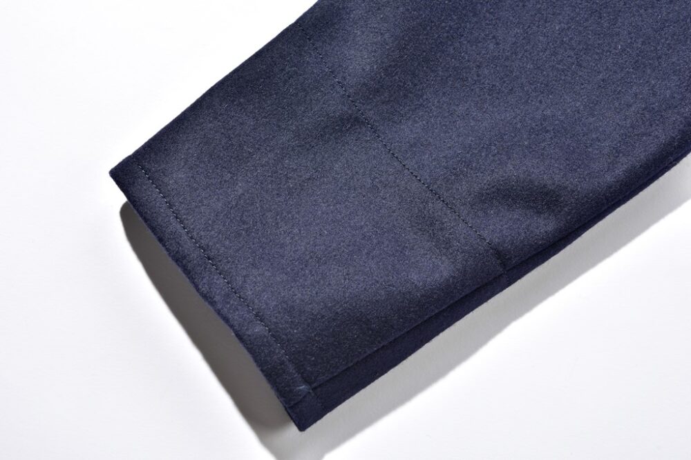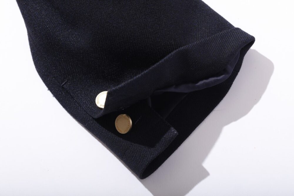 柔らかなフランネルウールを使用したダブルブレストのサービスコート。ひと際目立つ金ボタンには「U.S.N」の刻印が施される。ライニングはキュプラを配し、「NAVAL CLOTHING」の織りネームが付けられている。¥132,000_(The REAL McCOY’S TOKYO Tel.03-6427-4300)
