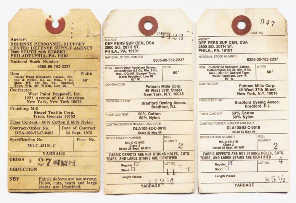 M-65フィールドジャケットを製造するために、米国政府がコントラクターに供給する生地に付けた管理タグ。