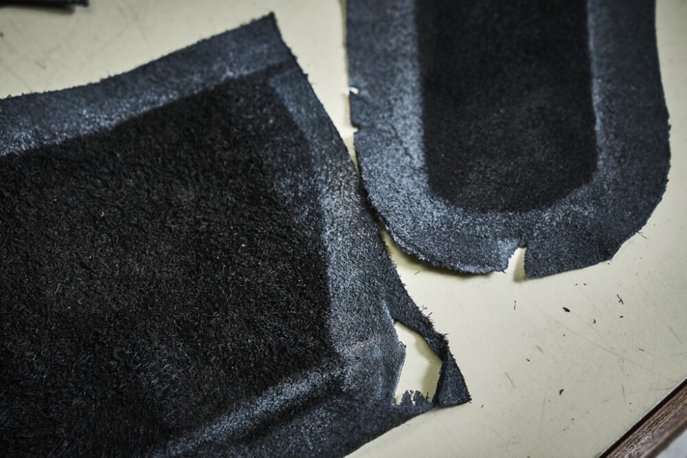 縫い代や革の合わさる部分を薄く漉いていく。1.3㎜の鹿革を0.8㎜に漉いていくのだが、鹿革の場合、その繊維質の関係から伸縮性が強いため、漉き機にかけると巻き込んでしまい破れてしまうことも。細心の注意が必要となる。