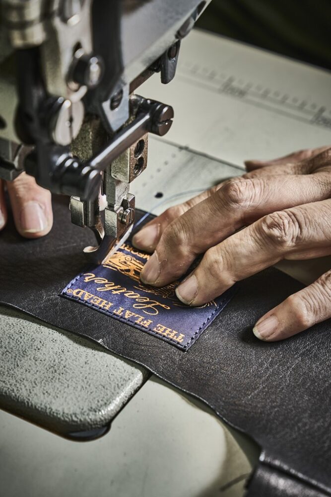 THE FLAT HEADの証、オリジナルタグを縫い付けていく。クルマやモーターサイクルなどTHE FLAT HEADの世界観が象徴的に描かれる。