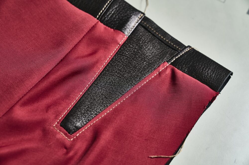 ディアスキンのシングルライダースLJ-DS01の袖口にマチを縫い付けていく。このマチは鹿革を2枚合わせた贅沢な仕様だ。