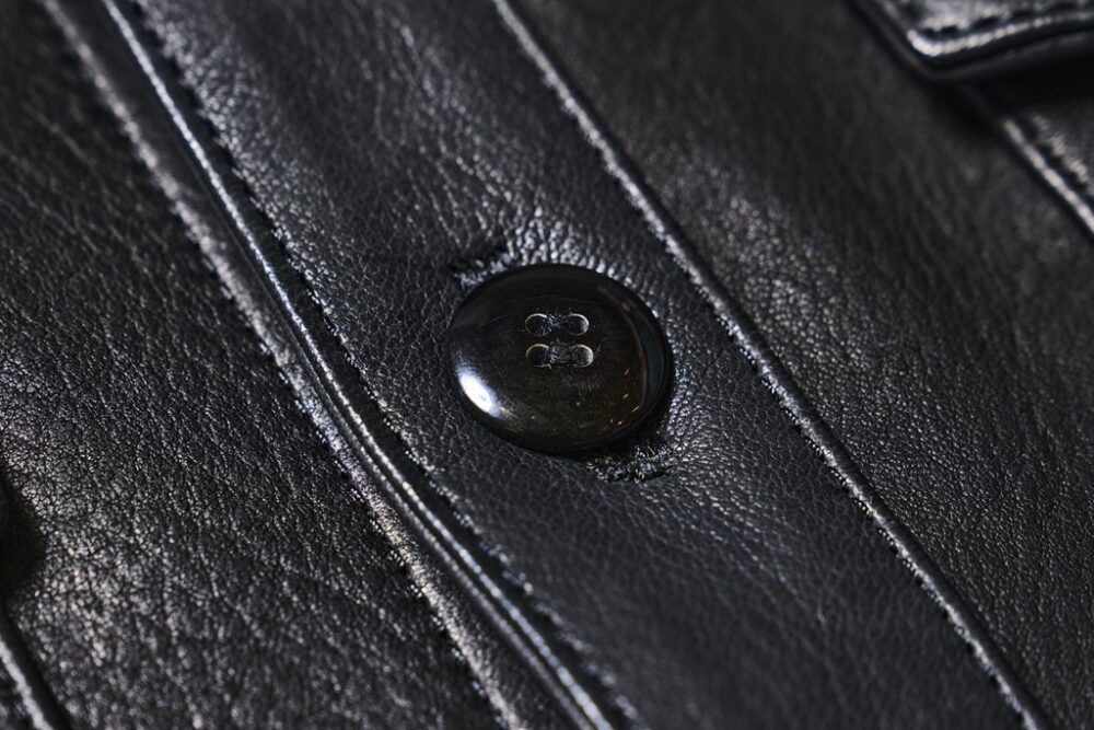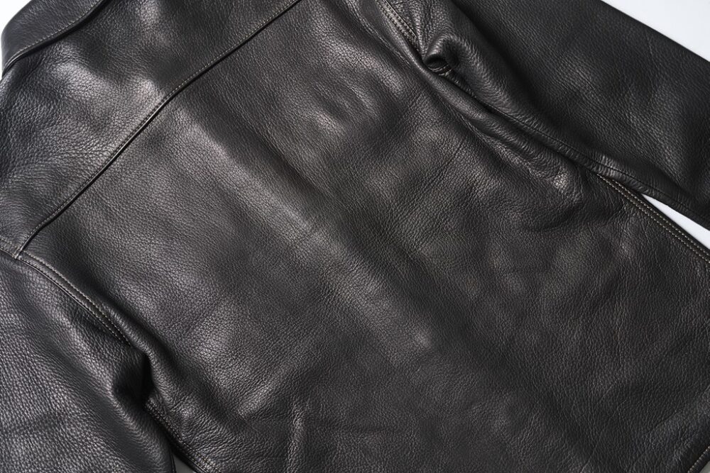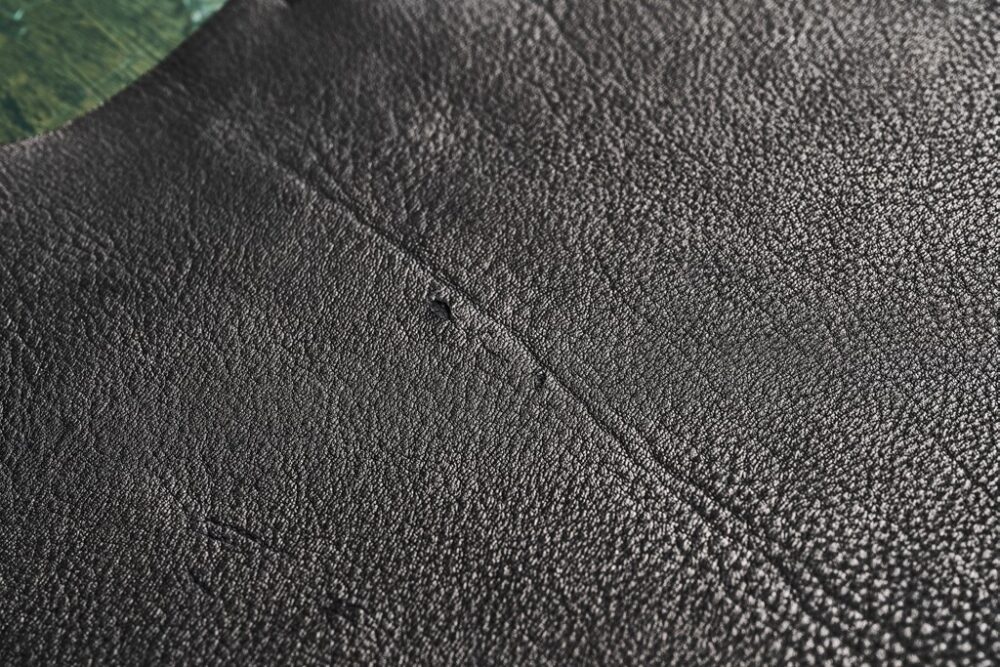 こちらの筋が鹿革の背骨部分。THE FLAT HEADでは、この部分をジャケットの背中心に配している。そのため繊維の伸びる方向が着用者の動きに沿い、着心地もよくなる。鹿革は柔らかく、繊維が絡んでいるため粘りがあるのが特徴。中心を走る筋が、鹿の背骨のライン。THE FLAT HEADでは渋鞣しで素上げの鹿革を使用しており、革本来の風合いが味わえる半面、傷などが目立ってしまうため、原皮の状態に左右されてしまう。厚みは1.3㎜に指定している。