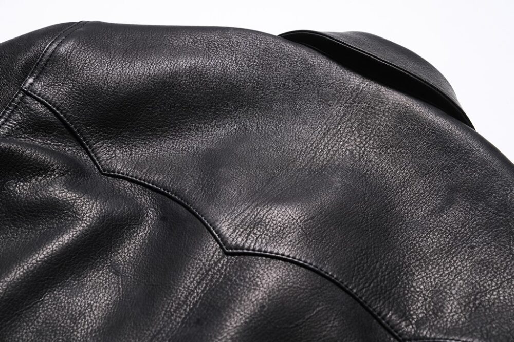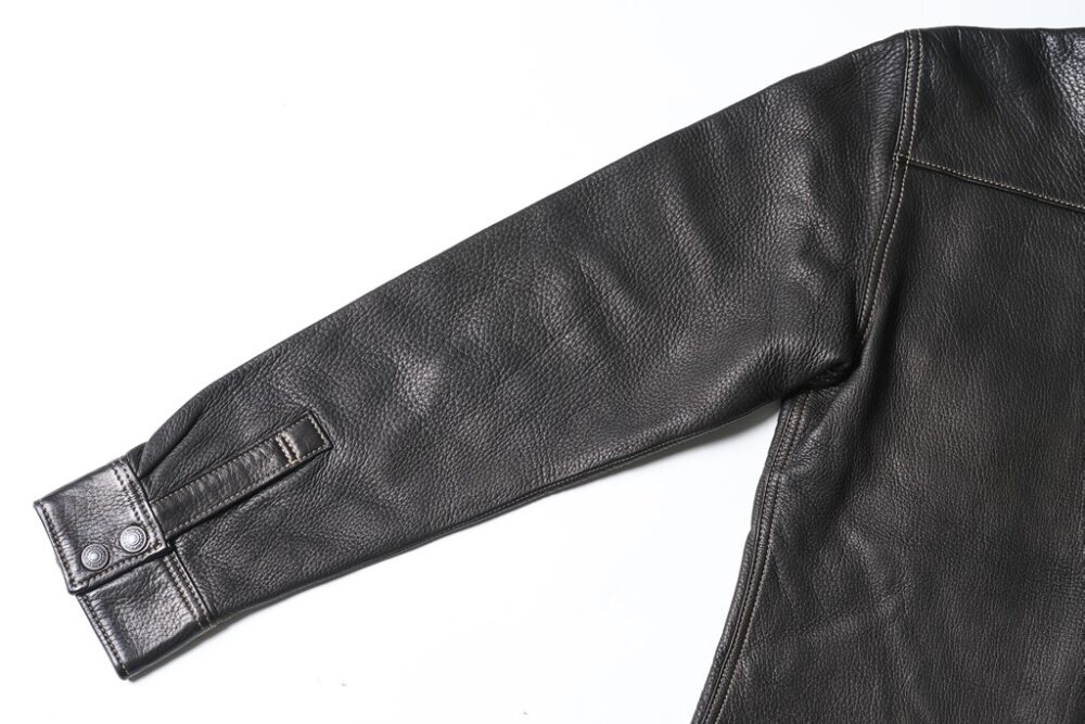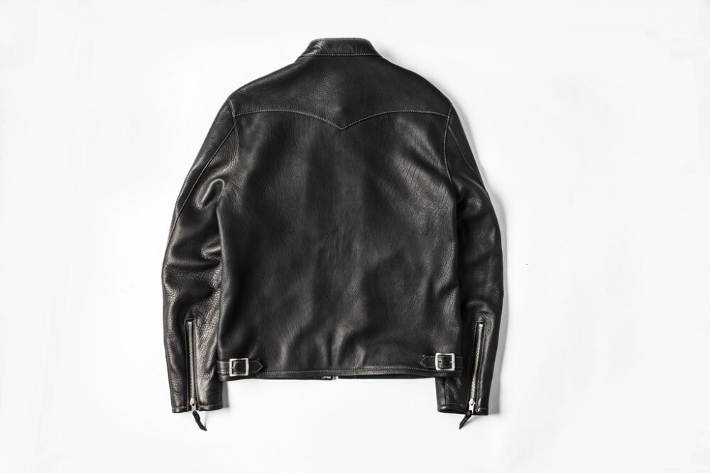 「逆ハ」デザインの胸ポケットが印象的なスタンドカラーのシングルライダース。タイトなシルエットで、袖を通すと鹿革に包み込まれるような着用感が味わえる。1.3㎜厚の渋鞣しの鹿革は、着用するほどに体に馴染み、表面が擦れて特有の光沢が出現する。背面にはウエスタンヨークが設けられ、デザイン性も高い。27万5000円