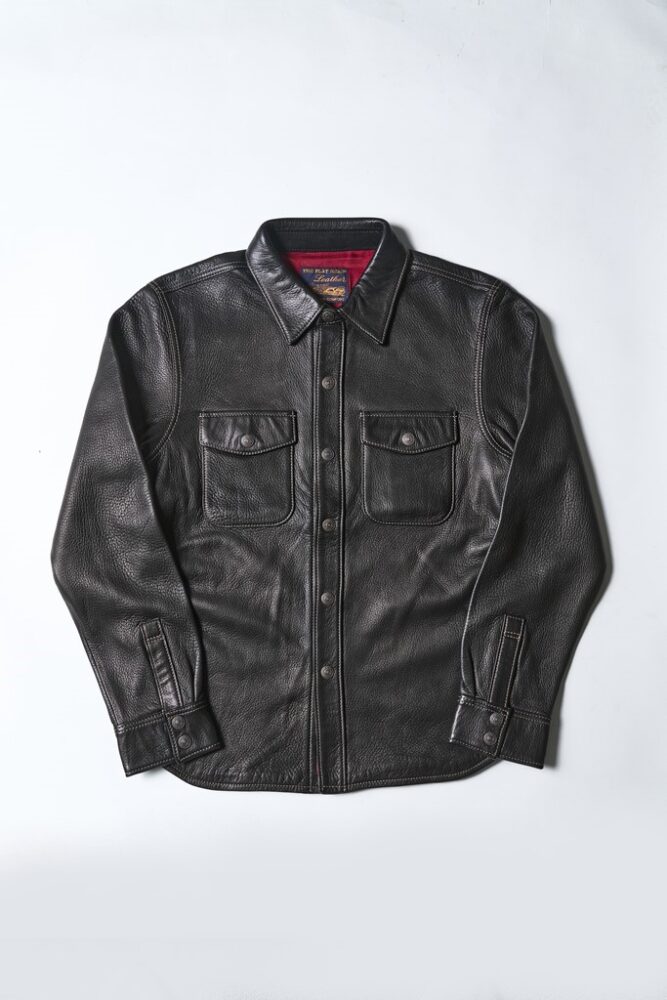 THE FLAT HEAD設立当初からラインナップされるディアスキンシャツLS-DS001。ワークシャツをイメージしたデザインで、ジーンズとの相性も抜群の1着に仕上がっている。革の背骨部分を背面の中央部分に配しているため、タイトフィットながら着用ストレスもない。THE FLAT HEADの定番アイテムだ。19万8000円