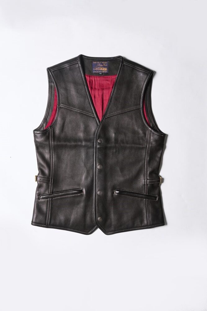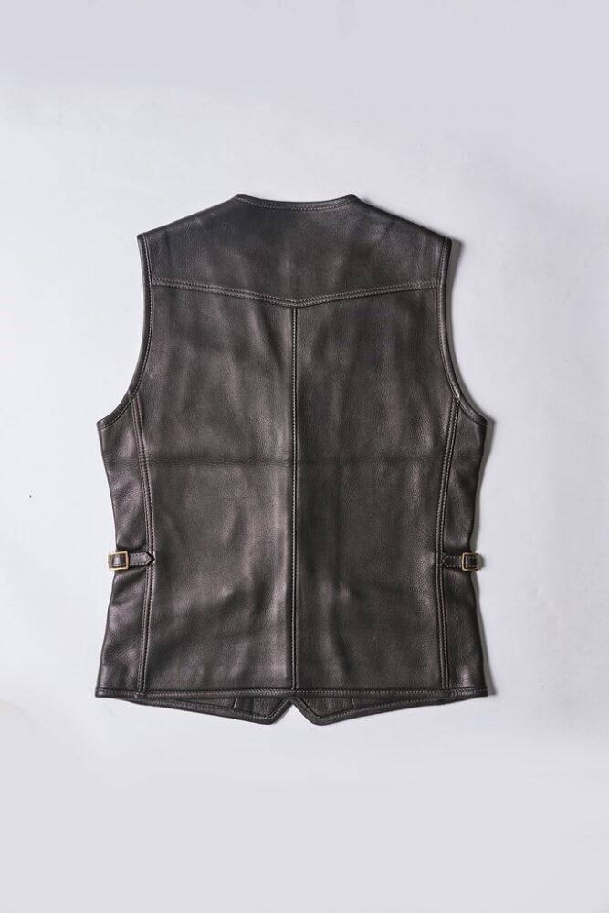 通気性と保温性に優れたディアスキンで仕立てたベストは、シャツの上から羽織ってもよし、インナーとしても重宝するため1年を通して着られる汎用性の高い1着。鹿革の背を中心にパーツを裁断しているため、着用感も良好。フロントは着脱も容易なスナップボタン仕様で、特製の鉄製バックルがアクセントになっている。15万4000円
