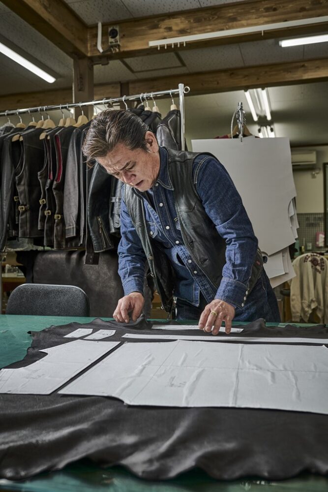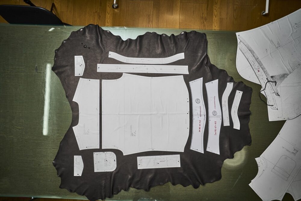 レザージャケット作りは、パーツ取りから始まる。鹿革は傷が多いので、それらを見極めながら、型紙を置いていく。
