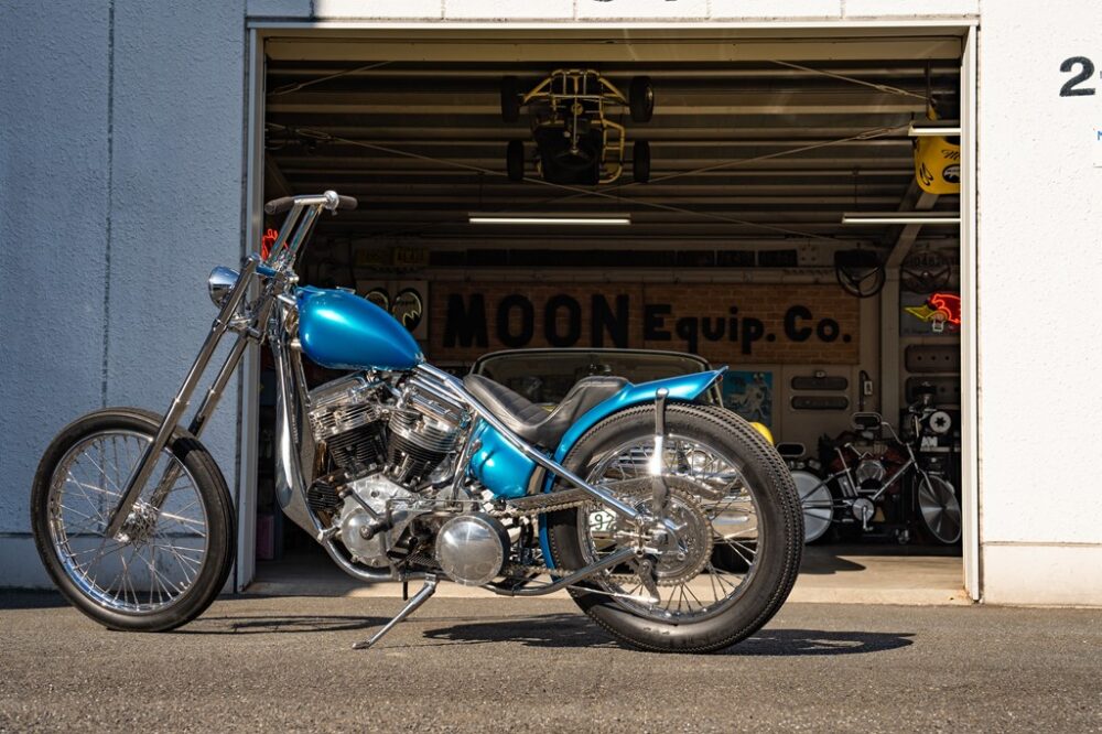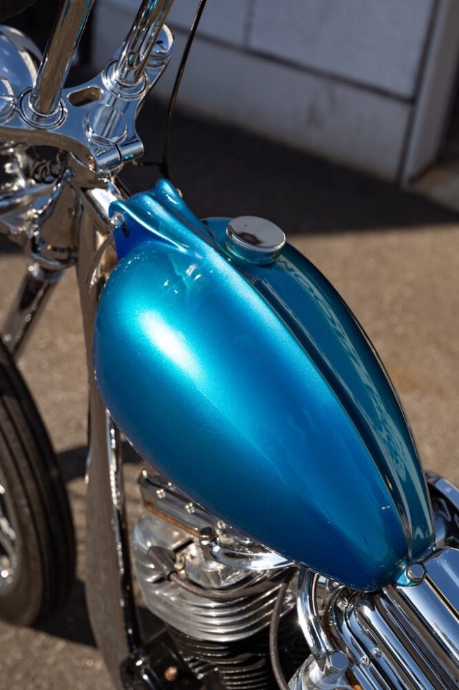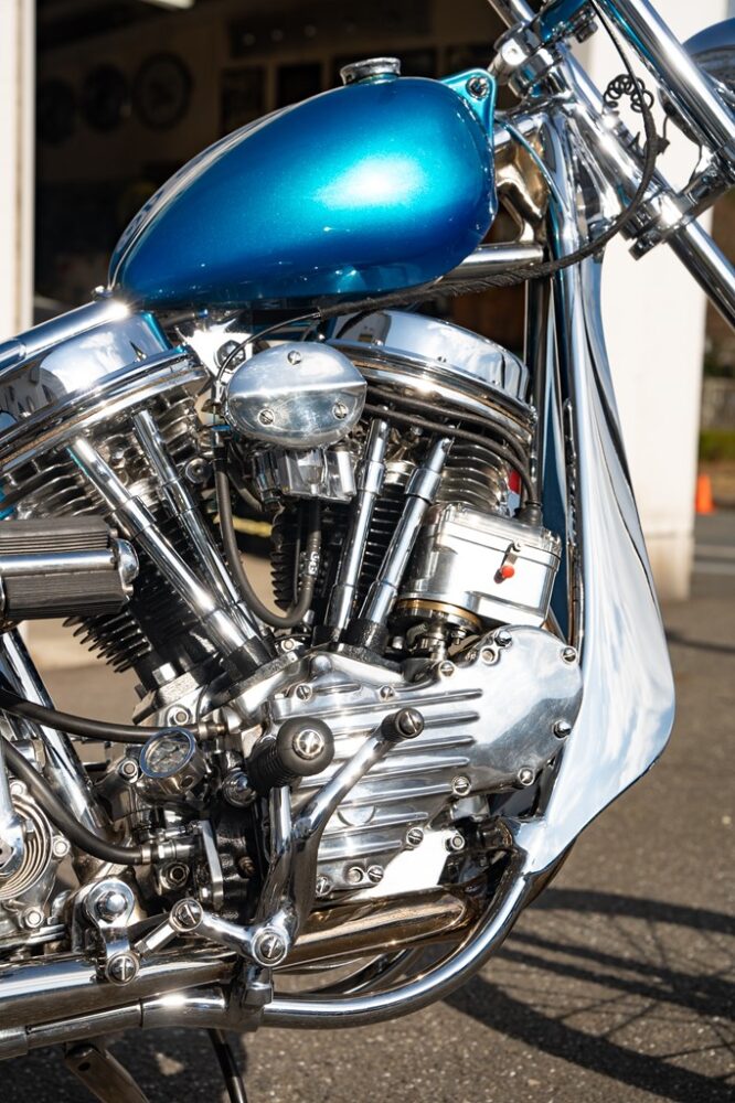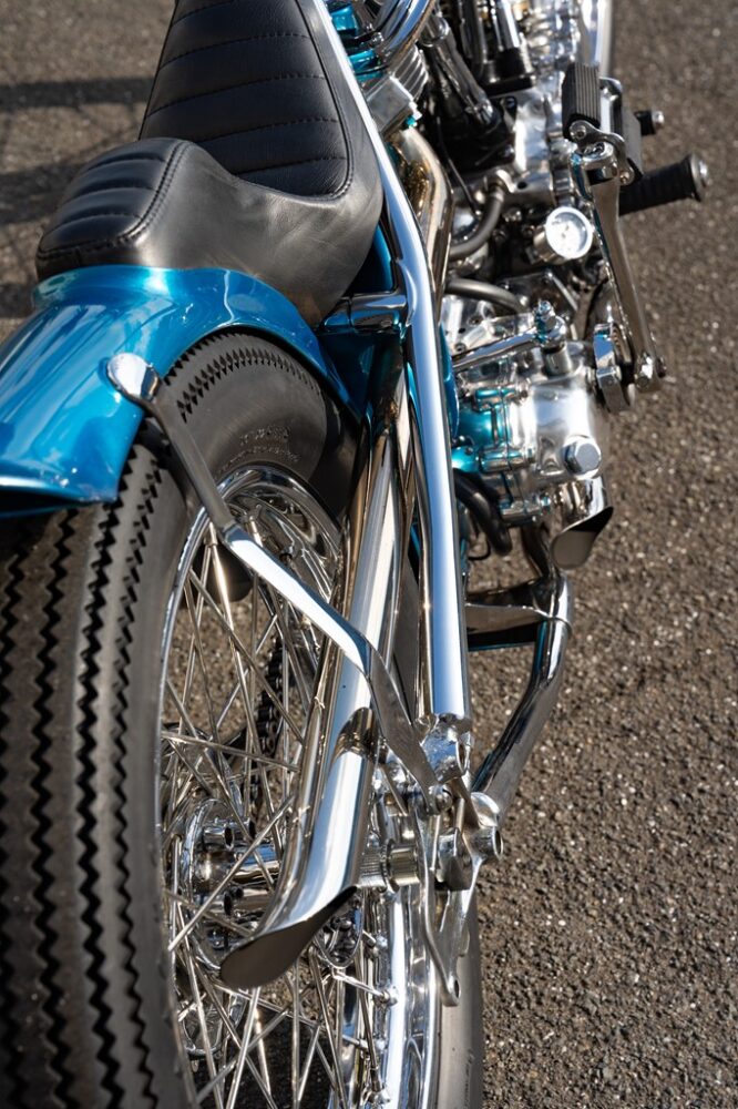 ダウンチューブの形状が特徴的なストレッチフレームは、’54年をベースとしたものだがパテを用いずクロームで仕上げたメタルワークスキルが光るディテールだ。ワンオフのスライダーを備る35φのロングフォークに始まり、フレームの内側を通したエキゾーストや、オリエンタルブルーでペイントしたワンオフのエクステリア、F21-R19インチホイールのセットアップなど、奇を衒うことなく一貫したテーマのもとにスタイリッシュなフォルムを追求。そして、2021年8月にBORN FREEにエントリーして、今回日本に到着するまでに6000マイル以上を走行するリアルに走れるショーバイクなのだ。