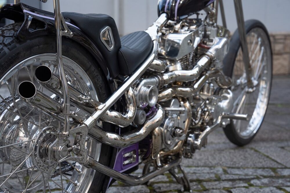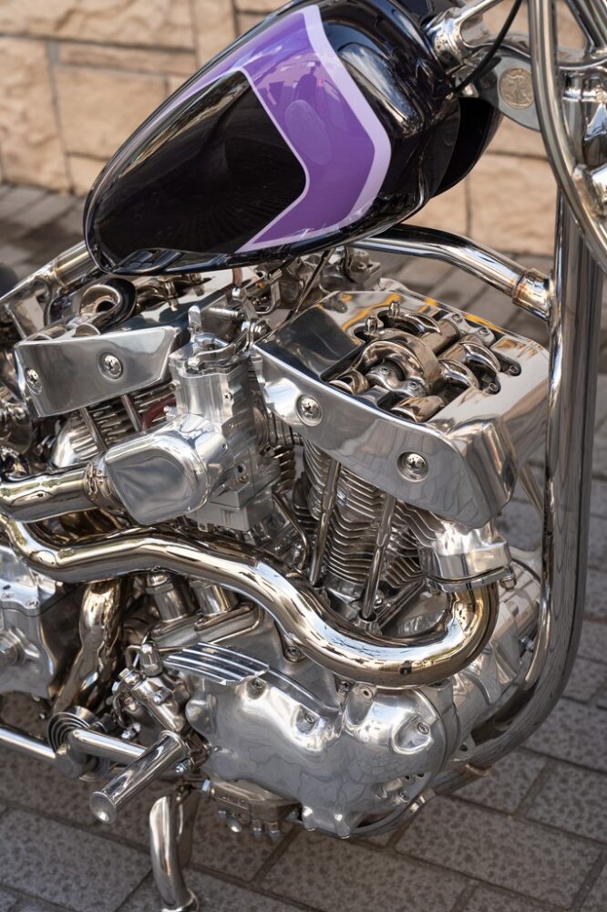 さらにツインキャブ、ツインターボを装備。ワンオフのステンレスフレームはオイルラインの役割を兼ね、クレードルにオイルクーラーを内蔵。チョッパーのスタンダードなシルエットを逸脱することなく、ビルダーのクリエイティブなアイディア、そして、それを具現化する驚異的なスキルが遺憾無く発揮された1台だ。